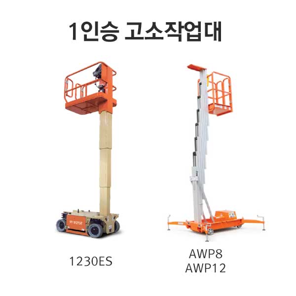 ①AMWP11.5: (작업높이)11.2M, (적재중량)200KG, (동력)배터리